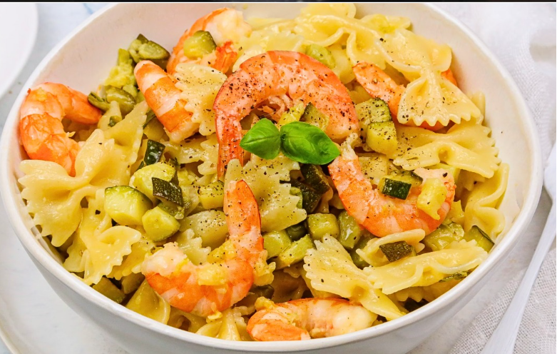 Makaron z krewetkami i cukinią to proste i pyszne pierwsze danie, idealne na rodzinny obiad lub kolację na bazie ryb. To danie łączy w sobie smaki lądu i morza w szybkim i smacznym sosie.