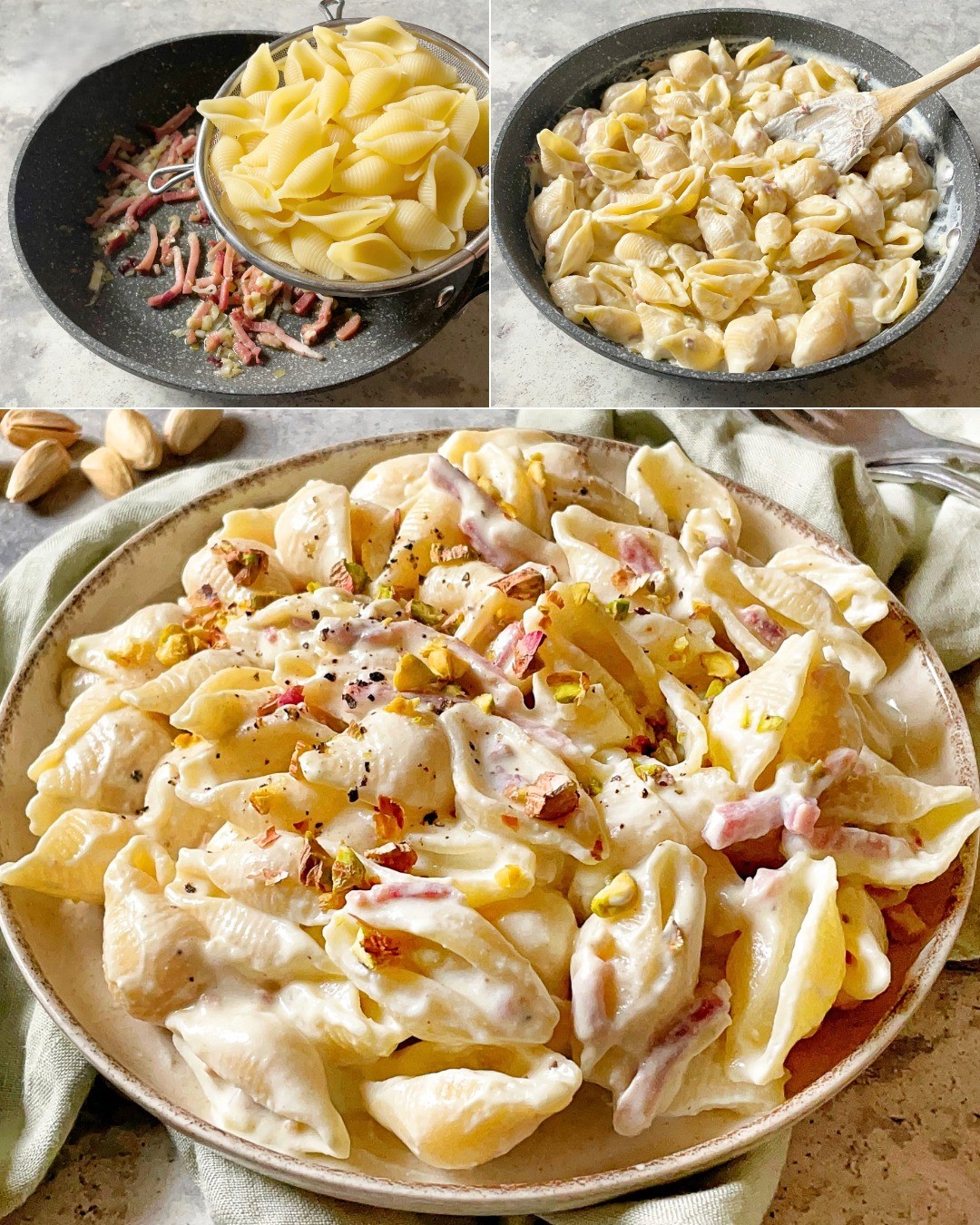 Makaron z ricottą i speckiem to smaczne i wyjątkowo apetyczne danie, w którym kremowość i delikatność sera ricotta idealnie łączy się ze słonością i chrupkością wędzonej szynki, a całość jest wzbogacona i dodatkowo aromatyzowana pesto z pistacji.